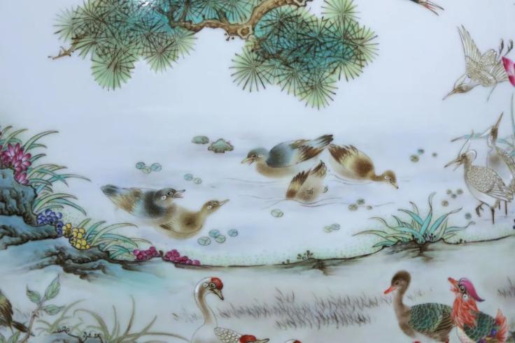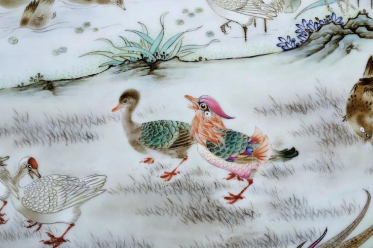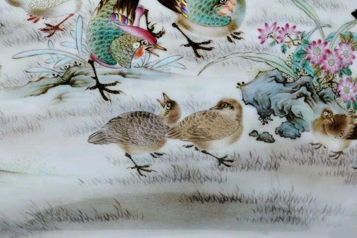 以粉彩细工技法精心对鸳鸯翎羽刻画。其中雄鸟羽身华丽,引颈向上顾盼,似正与树上的飞鸟鸣声交流,又似对鹅群中间的落花产生了兴趣,颇为莞尔。