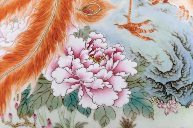 凤凰为主题图案,一倨一栖,彤红岸伟。其目睛含神,如意高冠,领翅如刀,尾扬似火即“火焰尾”也。足下皴石俊秀,周围牡丹盛放。瓷上绘事如此,为世所罕。