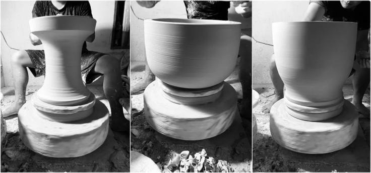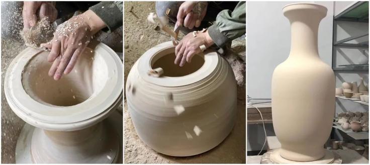 由于陶瓷烧造过程中有烧成缩率,所以初始坯达1米以上,拉坯时经过三接拉出成型;