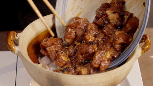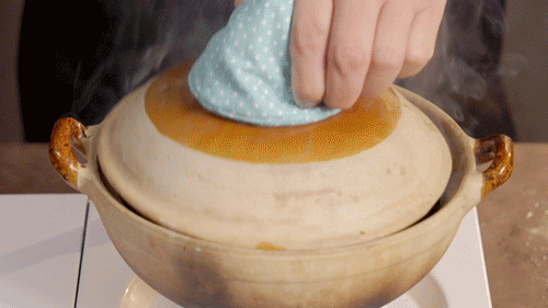 把腌好的排骨铺在配菜上,盖上盖子,从盖子边沿加入少许广东米酒,转成中火烧。烧的时候就能听到砂锅在“呜呜呜”地叫,8分钟左右排骨差不多就熟了。