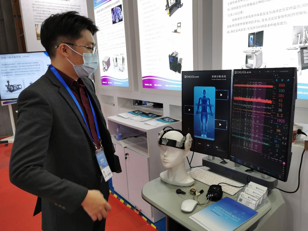 在5号馆脑科学产业专展上,记者看到一台心脑联合检测一体机——晕厥诊断及自主神经功能评价系统,由市德力凯医疗设备股份有限公司联合首都医科大学天坛医院共同研发。