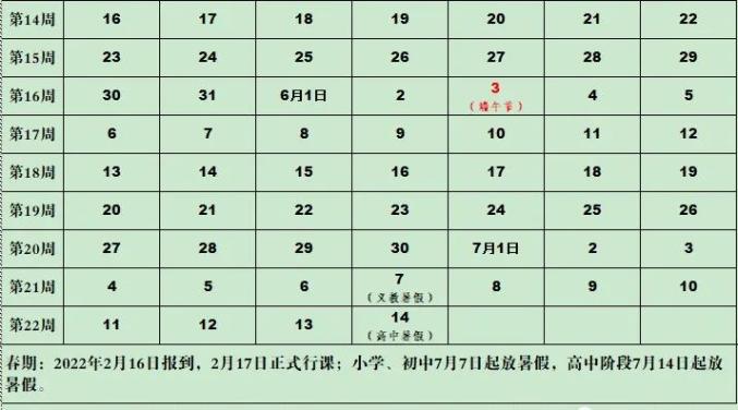 新学期开学时间:2022年2月16日在校生报到,2月17日正式行课(幼儿园,特殊教育学校,中等职业学校参照执行)