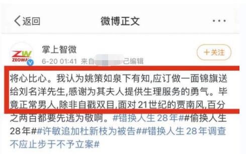 直到6月20日,据微博截图显示,“掌上智微”发文称“我认为姚策如泉下有知,应订做一面锦旗送给刘名洋先生,感谢为其夫人提供生理服务的勇气。毕竟正常男人,除非自戳双目,面对21世纪的贾南风,百分之二百都要先逃为敬啊”。刘名洋表示,那天开始,有很多同事、朋友、同行,甚至其他采访对象向其询问事情缘由,一些网友受到引导,也开始在该条微博下面发表不恰当的言论,令他身心受到很大影响。