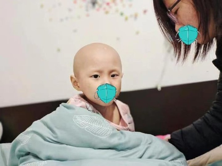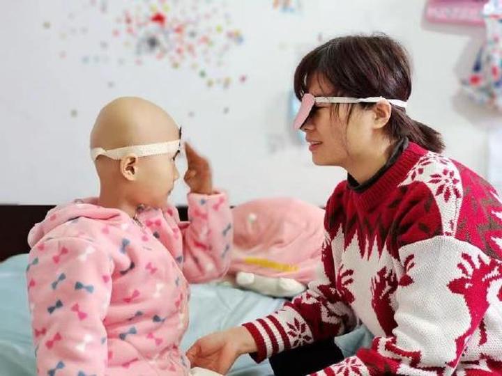 小晰接受了两年的化疗。我常常看着女儿曾经的照片愣神,那时的她就像小仙女一样漂亮,可如今的她,由于化疗掉光了头发,左眼因为真菌感染变白,治疗肿瘤的同时还要治疗眼睛。治疗眼睛的最佳方式是手术,但孩子的身体不好,只能药物维持。医生说孩子的眼睛需要保护,不能有一点异物进去,所以我用一块好看的布给她做了一个眼罩,小晰一直抵触这个东西,索性我也给自己做了一个和她一起戴,这样她才卸下了排斥心理。