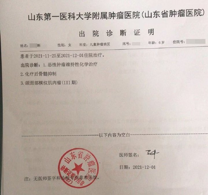 那天是2019年10月31日,是我噩梦的开始。我发现小晰的左脸肿大,带着她辗转了多家医院并没有得到准确的病因,孩子的病也没有一点好转。11月9日,孩子的左眼球竟然不会动了,被吓坏的我经过多方打听,最终去到了山东大学齐鲁儿童医院。医院做了检查表示小晰的病可能是横纹肌肉瘤。我不懂那是什么病,但那个“瘤”字让我心惊胆战。我本以为爱情已经让我跌进了谷底,直到孩子确诊这天,我才真正了解到什么叫万念俱灰。