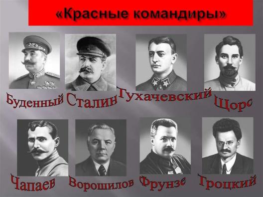 苏俄内战红军指挥官(上左至右)布琼尼、斯大林、图哈切夫斯基、肖尔斯;(下左至右)恰巴耶夫、伏罗希洛夫、伏龙芝、托洛茨基)