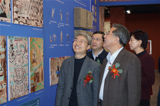 12月27日,“觉色敦煌 莫高精神”敦煌石窟艺术展在敦煌研究院兰州分院敦煌艺术馆开幕。省委宣传部副部长、省文化和旅游厅党组书记、厅长陈卫中,省委宣传部副部长李润强,省文化和旅游厅党组成员、省文物局局长马玉萍,敦煌研究院党委书记赵声良,敦煌研究院党委副书记、纪委书记廖士俊,敦煌研究院副院长罗华庆参加展览开幕式,并为本次展览揭幕。