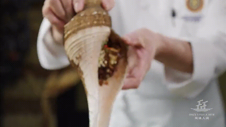 响螺加高汤,连壳炭烤,慢慢煨熟,等汤中的精华全部化入螺肉时,趁热切薄片,弹牙爽口,浓郁的鲜甜味带着韧劲儿: