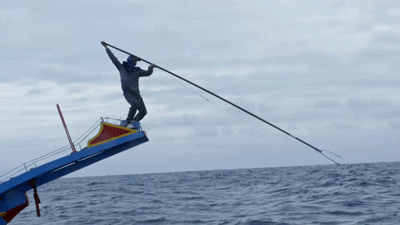 颠簸的海面,小船随浪飘摇,年轻的镖鱼手站在船头,手持20多公斤的三叉镖竿,在最恶劣的风浪天与海洋的短跑冠军旗鱼斗智斗勇,身形如同海神一般。