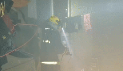 店内还有一人被困,消防员到场后发现,起火的是一家两层楼的沿街店铺,着火点在一楼,现场浓烟密布,明火已被喷淋浇灭。被困人员正趴在二楼窗口等待救援。由于二楼距地面太高,沿梯下楼不安全,消防员采用了内攻救援。