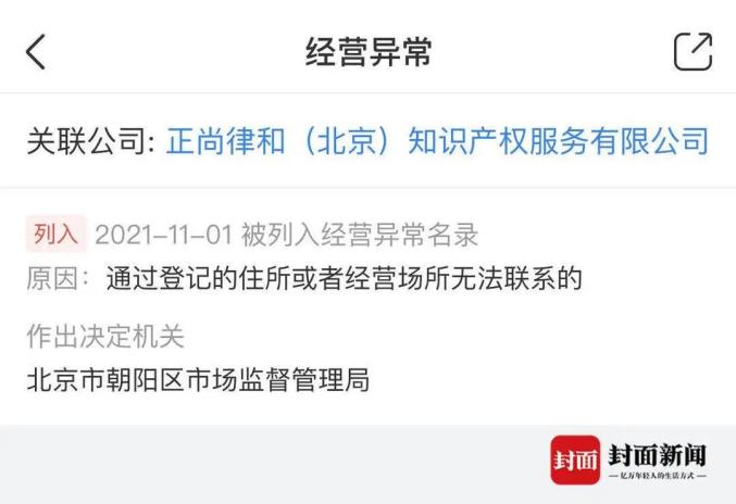在查阅正尚律和相关信息时,记者还注意到,就在2021年11月1日,正尚律和被北京市朝阳区市场监督管理局列入了经营异常名录,理由是通过登记的住所或者经营场所无法联系。该信息在天眼查中显示为“高风险信息”。公开信息还显示,该公司投资的正尚律和(贵州)知识产权服务有限公司也进行了简易注销。