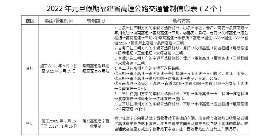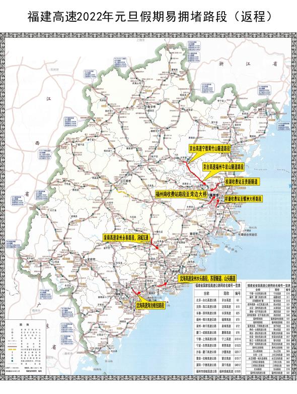 预计福建省高速公路2021年12月31日18时至20时,2022年1月1日8时至11时出程车流增大,2021年1月3日16时至20时返程车流增大。