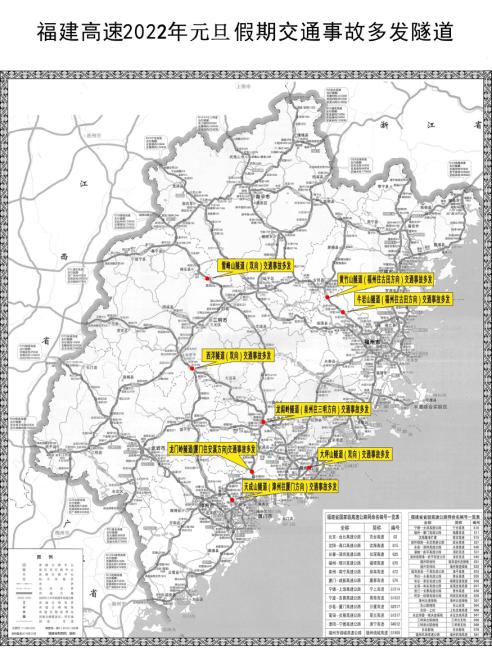 据统计,近3年来全省高速公路隧道发生交通事故较多隧道如下:京台高速牛岩山隧道、黄竹山隧道(福州往古田方向)、沈海高速大坪山隧道、泉南高速龙阁岭隧道(泉州往三明方向)、沙厦高速龙门岭隧道(厦门往安溪方向)、厦蓉高速天成山隧道(漳州往厦门方向)、泉南高速西洋隧道、福银高速雪峰山隧道。