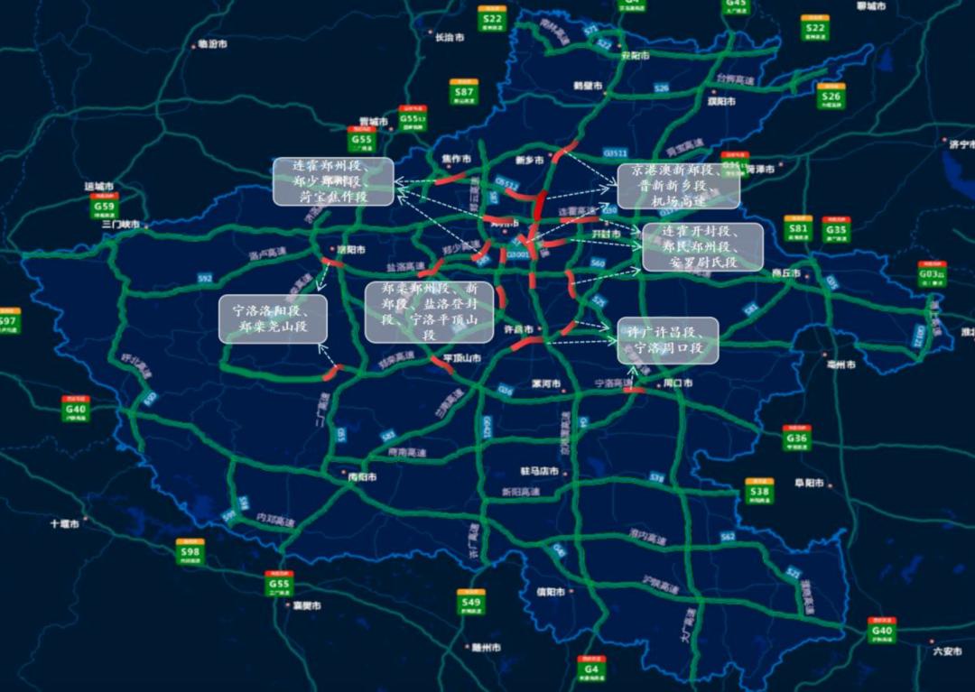 元旦期间,以郑州为中心向外辐射的短途出行车流占全省比重较大,预计全省易堵路段分布情况如下:
