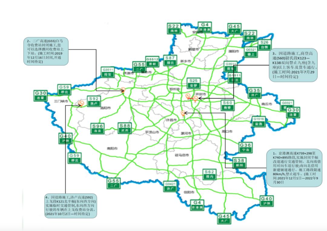 2、二广高速(G55)白马寺收费站封闭施工,您可以选择瀍河收费站上下站。(施工时间:2019年12月16日—时间待定)