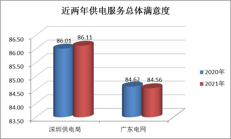 一、广东电网、深圳供电局供电服务满意度为84.56分和86.11分,均达到优秀水平。广东电网满意度保持稳定,深圳供电服务满意度略有提升