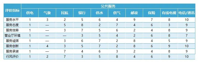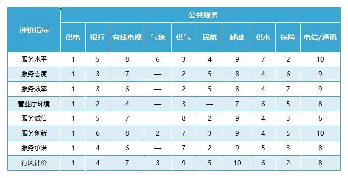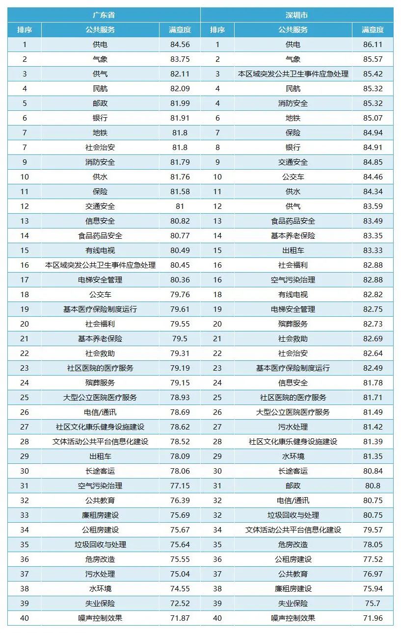 在服务水平、服务态度、服务效率、营业厅环境、服务诚信、服务创新、服务承诺、行风评价等八个共性指标评价方面,供电服务与供水、供气、气象、电信、有线电视、邮政、银行、保险、民航等公共服务的横向比较中,广东电网、深圳供电局均具有明显优势,在八个方面的公众满意度均位居第一位。这表明,我省供电系统努力构建现代供电服务体系,全面提升供电服务水平,持续优化用电营商环境,全面满足人民对美好生活的电力需求,为群众和企业提供可靠、便捷、高效、智慧的新型供电服务,获得公众的明显感知和充分肯定。