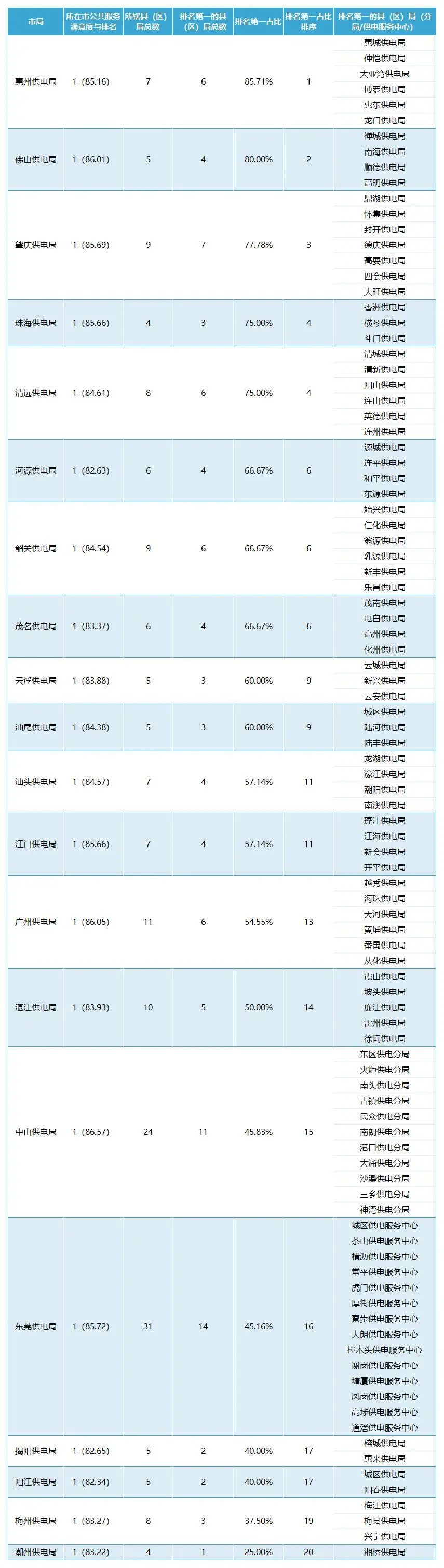 广东21个地市供电服务满意度第六次实现满意度第一的“大满贯”。惠州供电局县(区)局供电服务满意度排名第一占比最高(85.71%),其次是佛山供电局和肇庆供电局,位居第一位的县(区)局数占比分别为80%和77.78%。