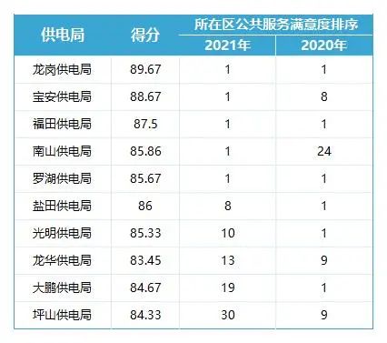 深圳供电局所辖10个区局中,有5个区局的供电服务位居所在区政府公共服务满意度第一位,占所有区局的50.00%,分别是:龙岗供电局、宝安供电局、福田供电局、南山供电局和罗湖供电局。