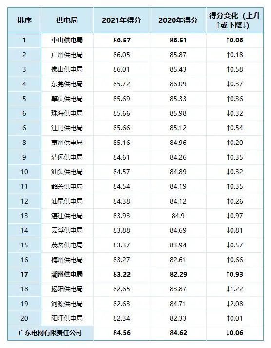 与2020年相比,有12个地市供电局的供电服务满意度有不同程度提高,其中,潮州供电局供电服务满意度得分提高幅度最大,较2020年(82.29分)提高了0.93分。