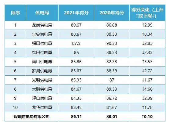 深圳供电局所辖的10个区局中,所有区局的供电服务满意度均达到80分以上的优秀水平。