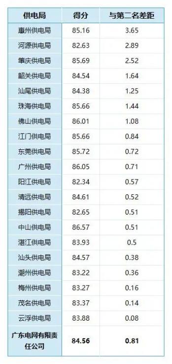 广东电网所辖的20个地市局中,各市局的供电服务满意度均达到80分以上的优秀水平。