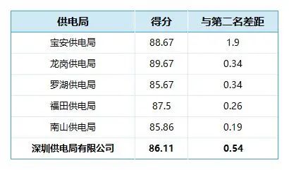 (二)深圳供电局所辖局供电服务满意度排名第一位的区局分别是:宝安供电局、龙岗供电局、罗湖供电局、福田供电局和南山供电局,这5个局供电服务与所在区公共服务满意度排名第二位的得分差值最大的是宝安供电局,比第二名高出1.9分。