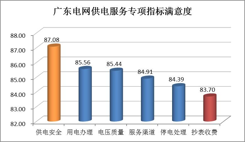 本次调查中,广东电网供电服务六个专项指标中,供电安全的满意度最高,得分为87.08分;用电办理(85.56分)、电压质量(85.44分)的满意度次之,抄表收费的满意度相对较低,为83.70分。