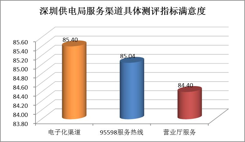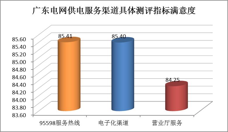 调查显示,广东电网供电服务渠道的满意度为84.91分,列供电服务六个专项指标的第4位。从服务渠道具体测评指标来看,3种主要渠道的满意度均达到优秀水平,其中95598服务热线的满意度最高,得分为85.41分;电子化渠道的满意度次之,得分为85.40分;营业厅服务的满意度相对较低,为84.25分。
