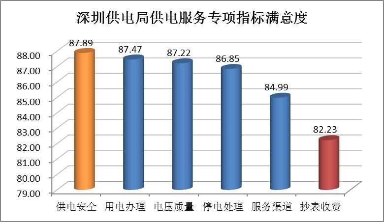 本次调查中,深圳供电局供电服务六个专项指标中,供电安全的满意度最高,得分为87.89分;用电办理(87.47分)、电压质量(87.22分)的满意度次之,抄表收费的满意度相对较低,为82.23分。