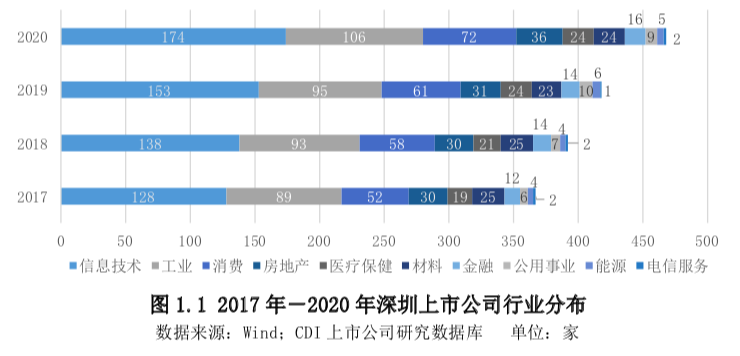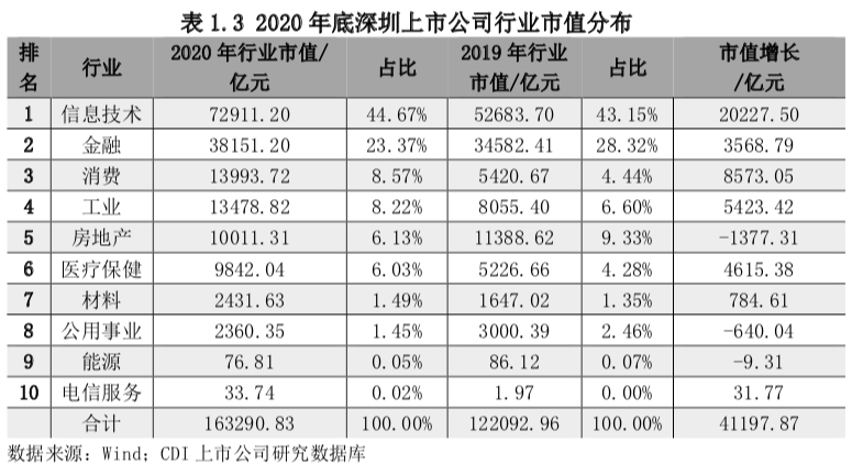 截至2020年底,466家深圳上市公司总市值达到16.33万亿元,同比增长33.74%。其中信息技术行业上市公司市值和金融行业上市公司市值合计占深圳上市公司总市值比重达到68.04%。