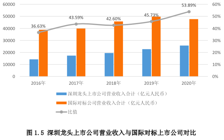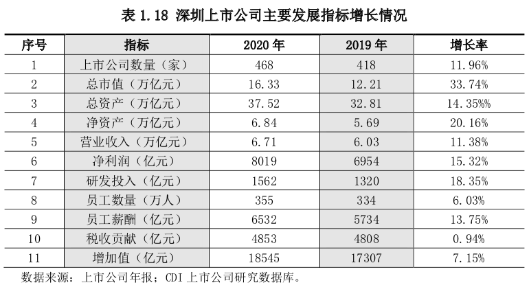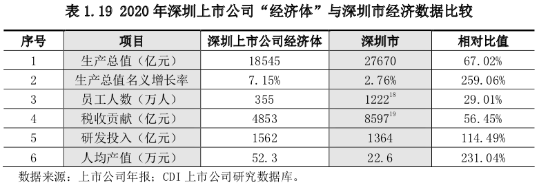 2020年“深圳上市公司经济体”创造的增加值达到1.85万亿元,约相当于同期深圳全市GDP的三分之二,比重较上年提升2个百分点;员工人数相当于深圳市职工人数29.01%,研发投入相当于深圳市研发投入的114.49%。