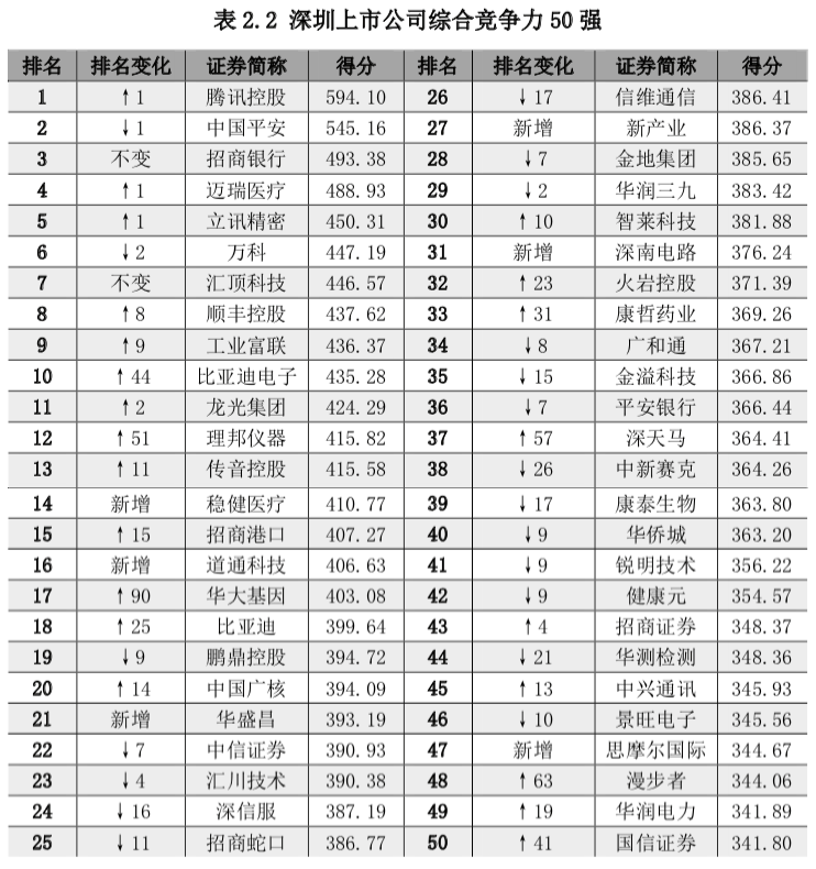 ——综合竞争力十强依次是:腾讯控股、中国平安、招商银行、迈瑞医疗、立讯精密、万科、汇顶科技、顺丰控股、工业富联、比亚迪电子。