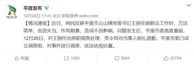此前,平度市委宣传部26日发布情况通报称:问题发生后,平度市委高度重视,12月26日,对王丽作出停职调查处理,责令其向当事人赔礼道歉。平度市委已成立调查组,对事件进行调查,依法依规处置。