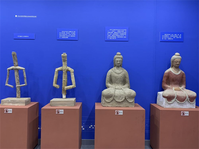 这是敦煌石窟艺术展展示的彩塑制作步骤