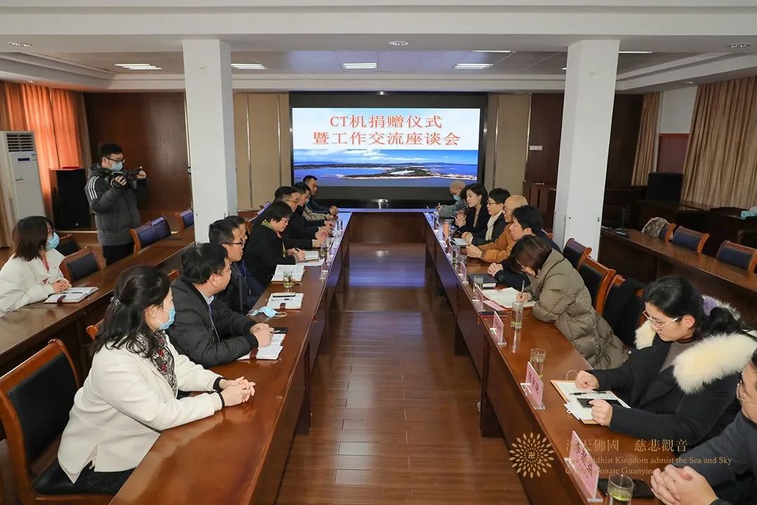在座谈会上,市卫健委、普朱管委会、普陀山镇领导先后讲话,对普陀山佛教协会捐赠CT的善举表示赞叹。普济医院院长钟素亚介绍了佛教协会捐赠CT的缘起,对会长道慈大和尚和佛教协会一直以来的关心支持表示感谢。她表示,CT拍片是新冠肺炎及众多疾病诊疗中的重要环节,在当前疫情常态化防控和医疗服务中发挥着重要作用。普济医院CT和舟山远程互联网医院的联合应用,必将为普陀山常住人员和广大来山香游客提供更加优质周到的诊疗服务。