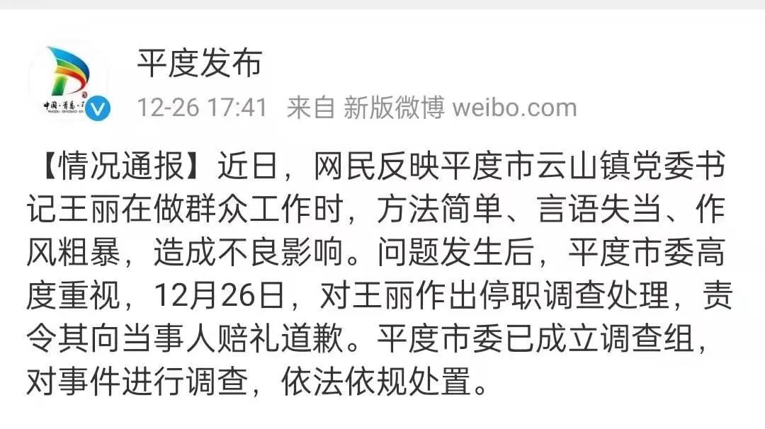12月26日,平度市委通过官方微博“平度发布”对外予以回应,对王丽作出停职调查处理,责令其向当事人赔礼道歉,并成立调查组对事件进行调查。28日,平度市召开全市干部作风整顿会议,全面查摆整改有关问题。山东省委派出省市联合调查组赴当地调查核实有关情况,并将及时向社会公布调查结果。