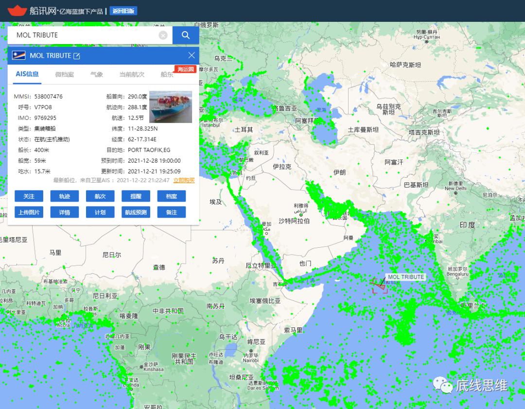 之后再登陆船讯网,查出MOL TRIBUTE的船舶位置,就能了解货物的大概位置。