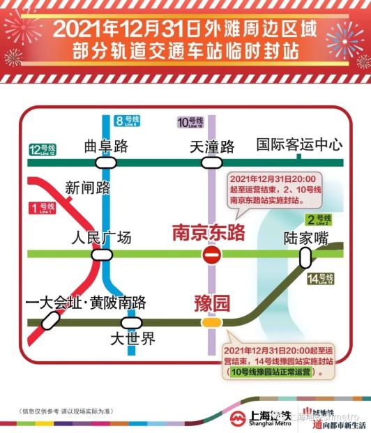 根据交通管制要求,为配合做好市中心商业区域的客流疏导,2021年12月31日20:00起至运营结束,上海地铁2号线、10号线南京东路站实施封站;14号线豫园站同步实施封站跳停(10号线豫园站正常运营)。封站期间,途经2、10号线南京东路站、14号线豫园的列车均不停站,车站不办理进出站及换乘业务。届时,车站将加强站内广播宣传、导向设置、站台站厅秩序维护等工作。