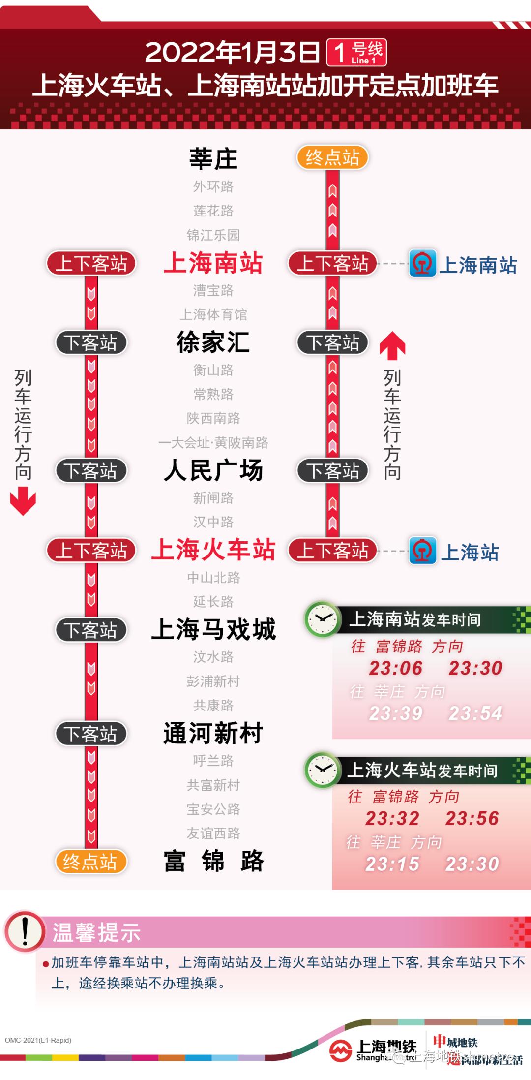 其中,1号线上海南站站往富锦路站方向定点加班车沿途仅停靠徐家汇站、人民广场站、上海火车站站、上海马戏城站、通河新村站、富锦路站,其余车站跳停。停靠车站中,上海南站站、上海火车站站可上下客,其余车站只下不上,途经换乘站不可换乘。