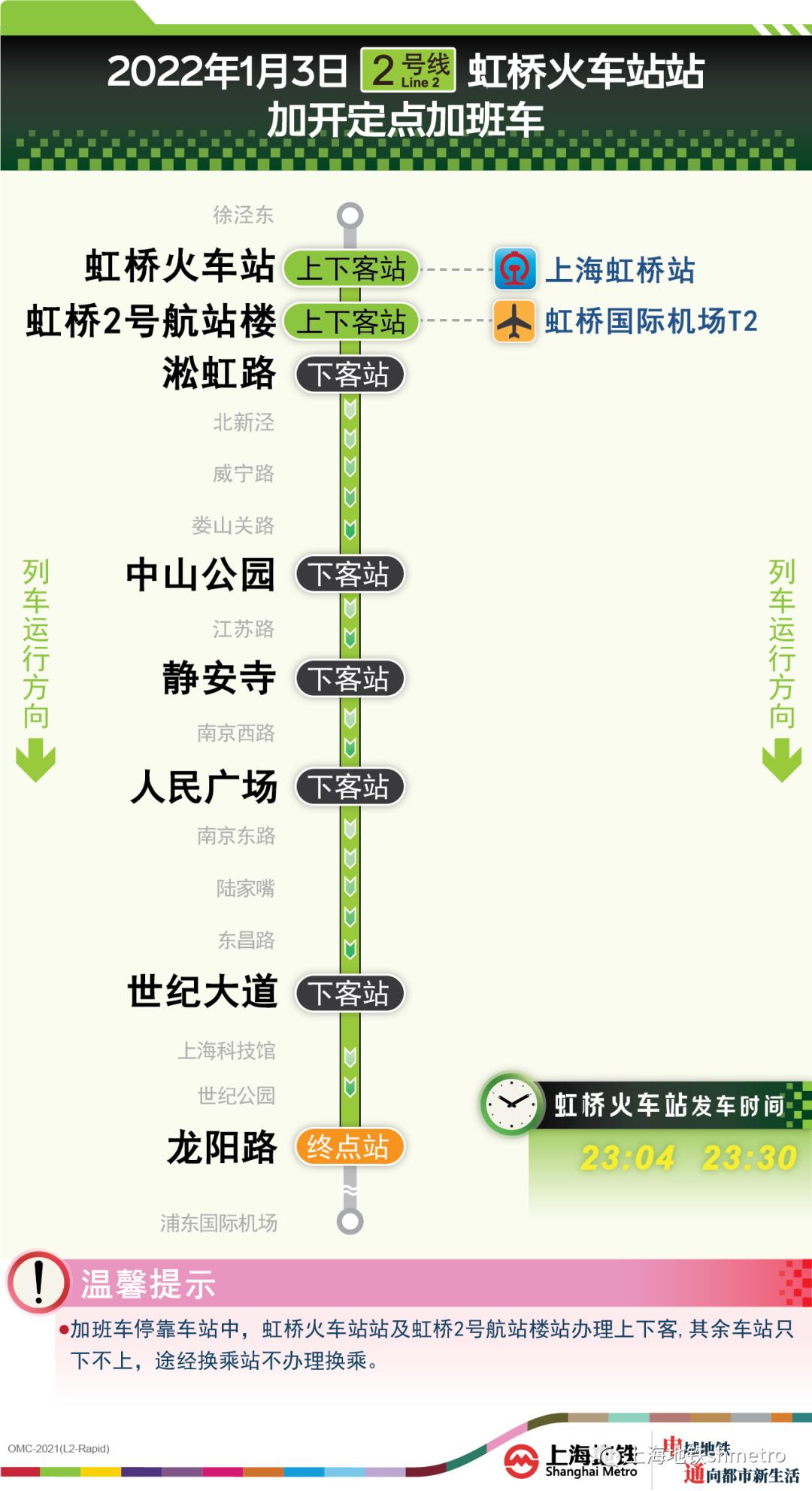 申通地铁集团介绍,为满足节日期间市民游客的出行需求,2021年12月31日、2022年1月1日,上海地铁1、2、7、9、10、13六线延时运营。同时根据交通管制要求,2021年12月31日20点起至运营结束,2、10号线南京东路站、14号线豫园站计划临时封站(10号线豫园站正常运营);2022年1月3日1、2、10号线在上海火车站站、虹桥火车站站和上海南站站加开定点加班车。详见↓