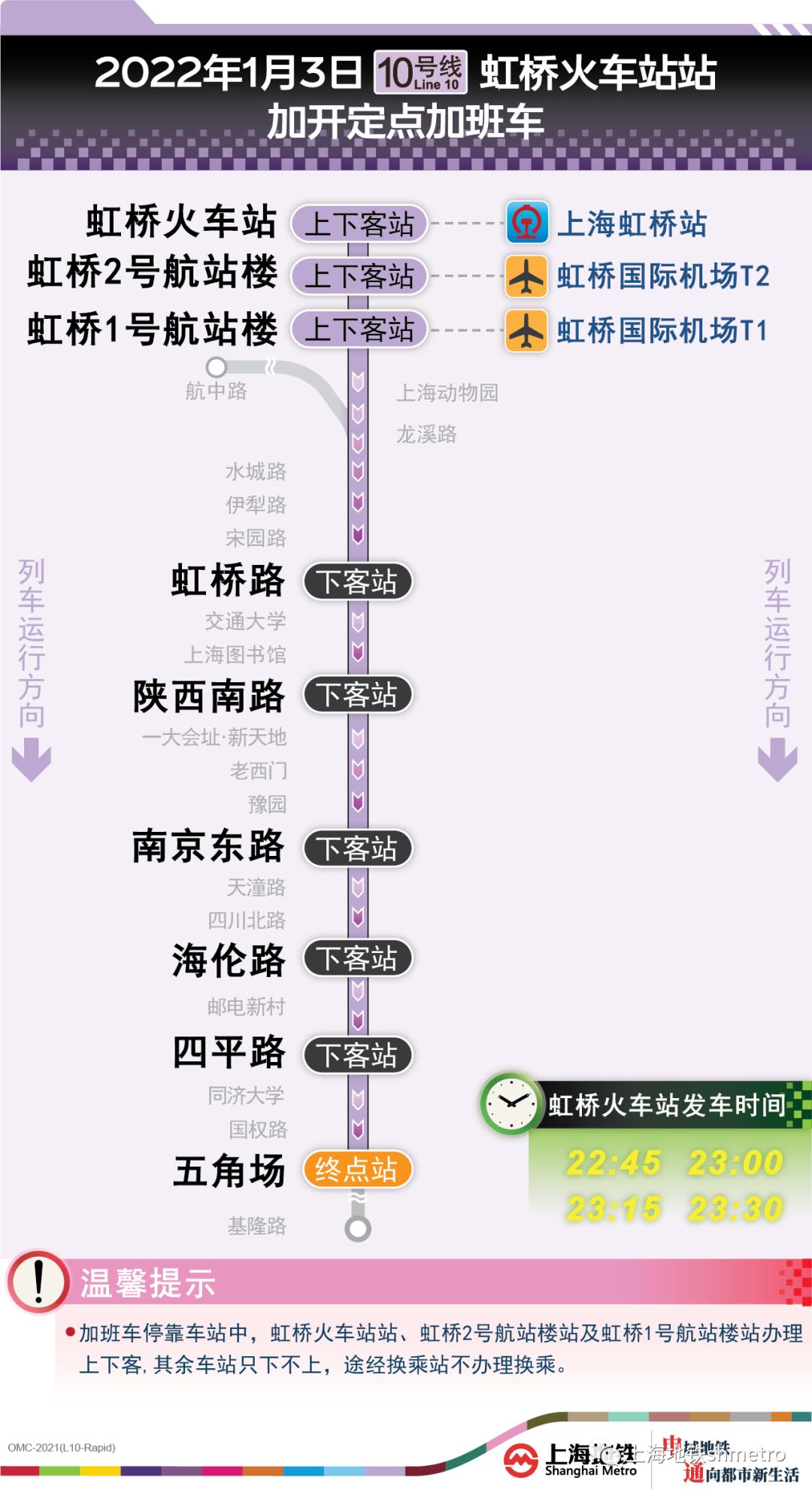 为提升元旦返程期间重要交通枢纽夜间疏散能力,根据计划,1月3日(周一),地铁1、2、10号线将加开定点加班车,末班车发车时间延长至23:30,定点加开列车途经换乘站均不可换乘。