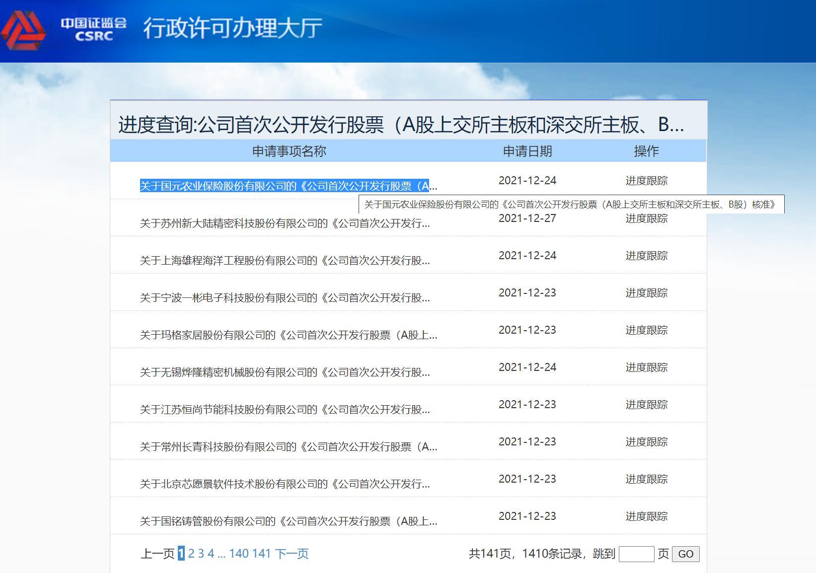 12月29日,记者获悉,证监会已接收《关于国元农业保险股份有限公司的<公司首次公开发行股票(A股上交所主板和深交所主板、B股)核准>的申请材料》。这意味着该公司上市进程已进入“发行审核”步骤,需经发审会通过,并拿到发行批文方能上市。国元农险相关负责人向《国际金融报》记者透露,公司暂未收到证监会受理通知。