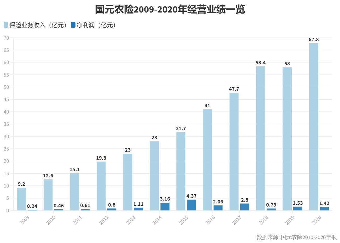 2009年至2020年,公司保险业务收入分别为9.2亿元、12.6亿元、15.1亿元、19.8亿元、23亿元、28亿元、31.7亿元、41亿元、47.7亿元、58.4亿元、58亿元、67.8亿元,净利润分别为0.24亿元、0.46亿元、0.61亿元、0.8亿元、1.11亿元、3.16亿元、4.37亿元、2.06亿元、2.8亿元、0.79亿元、1.53亿、1.42亿元。