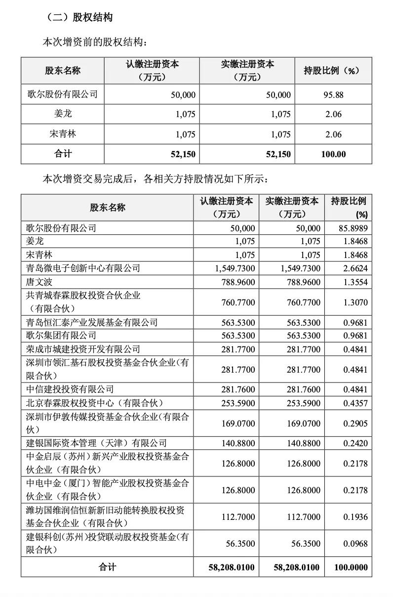 股权结构显示,引入战投前,歌尔微由歌尔股份、姜龙、宋青林分别持股95.88%、2.06%和2.06%。增资完成后,歌尔股份持股缩减至85.8989%,依旧是歌尔微的控股股东;青岛微电子创新中心有限公司2.6624%成为第二大股东,姜龙和宋青林为并列第三大股东。