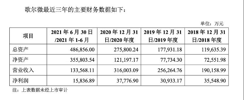 根据歌尔股份近期发布的歌尔微创业板上市预案(修订稿),2018年-2020年间,歌尔微的年度营业收入分别为19.02亿元、25.63亿元、31.60亿元,净利润为3.55亿元、3.09亿元、3.78亿元。今年上半年,歌尔微营收13.36亿元,净利润1.58亿元。