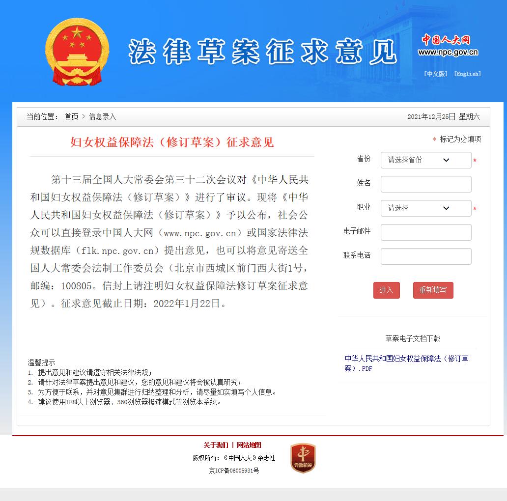 《中华人民共和国妇女权益保障法(修订草案)》12月24日在中国人大网公布,公开征求社会意见。各位姐妹可以直接登录中国人大网(www.npc.gov.cn)或国家法律法规数据库(flk.npc.gov.cn)提出意见,也可以将意见寄送全国人大常委会法制工作委员会(北京市西城区前门西大街1号,邮编:100805。信封上请注明妇女权益保障法修订草案征求意见)。征求意见截止日期:2022年1月22日。