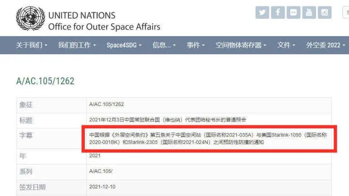 近日,中国常驻维也纳联合国和其他国际组织代表团罕见地以“照会”的方式,向联合国秘书长通报美国SpaceX发射的星链卫星,分别在今年7月、10月与中国空间站发生近距离接近事件。