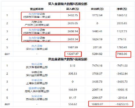盘后龙虎榜显示,资金博弈激烈,买入前五以“散户大本营”东方财富拉萨席位为主,分别占据买入第一、第三和第三位置,合计买入近9000万元。与散户高位接力猛干相反,游资则是大举出货。前五卖出总额达到1.88亿元,净卖出额达到1.83亿元,其中卖一位置“东北证券武汉香港路”就卖出7400多万。