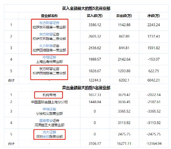 近三日的龙虎榜来看,基本也是散户接力游资甚至机构出货的画风,如周一买入前五有四个席位是东方财富拉萨系,而机构和“金田哥”则是卖出。周三东方财富拉萨系继续霸占买入前五四席,而知名游资营业部银河证券绍兴营业部和兴业证券陕西分公司则在出货。